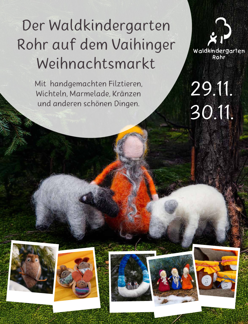 Auch in diesem Jahr sind wir mit einem liebevoll gestalteten Stand auf dem Vaihinger Weihnachtsmarkt dabei. Am Samstag, 29. November und Sonntag, 30. November 2025, rund um das Bezirksrathaus und den Vaihinger Markt. Freut euch auf duftende Plätzchen, selbstgemachte Marmeladen, kreative Adventskränze, filzige Tiere, lustige Wichtel und viele weitere handgemachte Kostbarkeiten aus unserem Wald!
